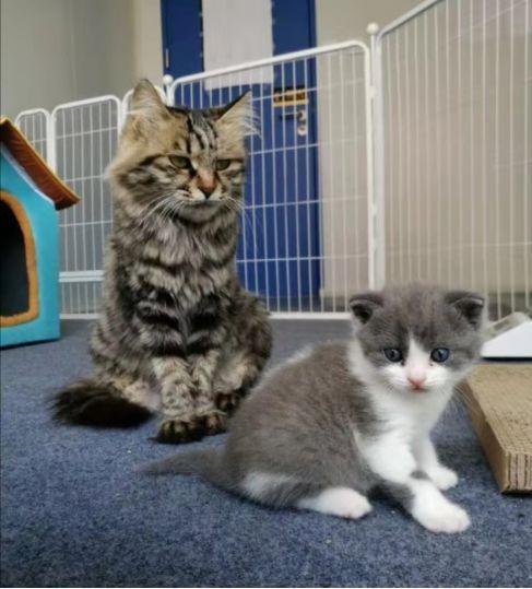 克隆猫“大蒜”(右)和代孕猫妈妈(左)